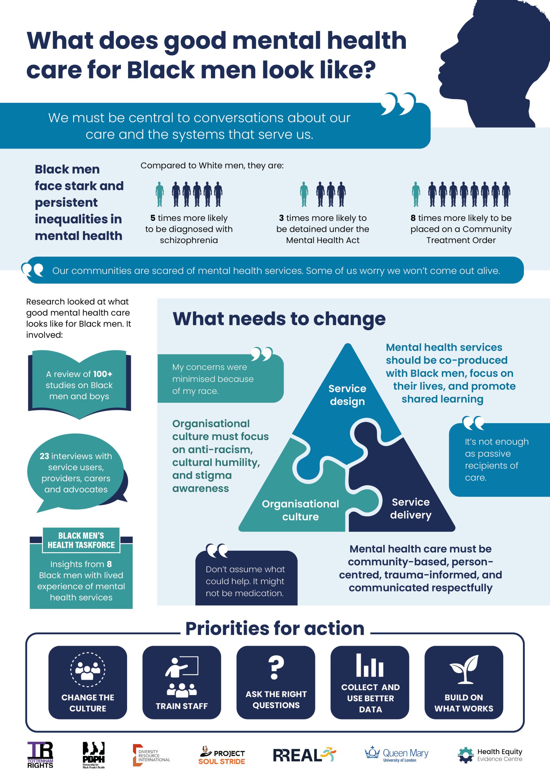 Too often, mental health services are not places of support for Black men who, instead of receiving good care, experience stigmatisation and trauma. Services are frequently designed without structural and institutional racism being effectively addressed and without considering the specific needs and contexts of Black men. Consequently, patterns of inequality persist across access, experience, diagnosis, and treatment.