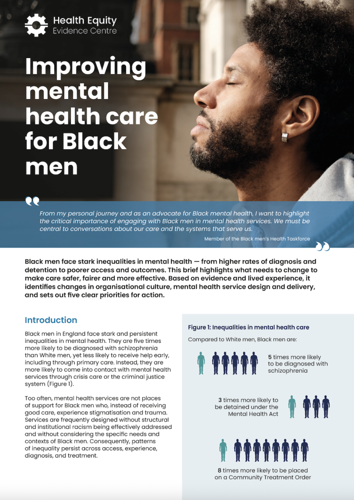 Black men face stark inequalities in mental health — from higher rates of diagnosis and detention to poorer access and outcomes. This brief highlights what needs to change to make care safer, fairer and more effective. Based on evidence and lived experience, it identifies changes in organisational culture, mental health service design and delivery, and sets out five clear priorities for action.