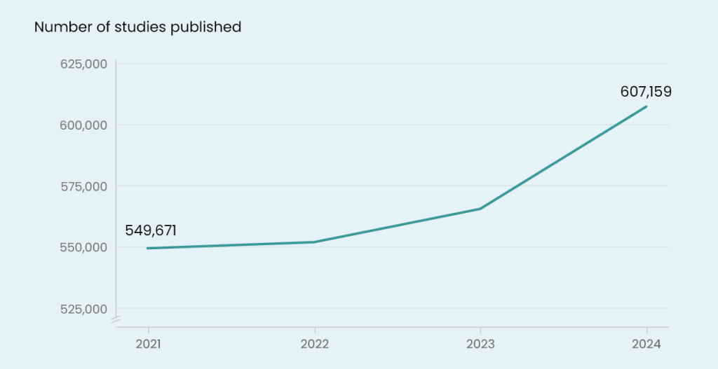 Annual number of PubMed-indexed articles related to health and care published each year, excluding COVID-19–related publications (search query: (“health” OR “healthcare” OR “health care”) AND [year][dp] NOT “COVID-19″[MeSH])