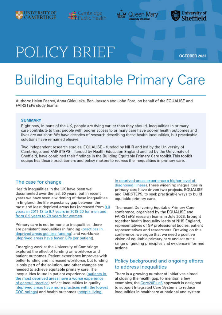 Two independent research studies, EQUALISE – funded by NIHR and led by the University of Cambridge, and FAIRSTEPS – funded by Health Education England and led by the University of Sheffield, have combined their findings in the Building Equitable Primary Care toolkit. This policy brief introduces the toolkit and draws out key recommendations for policymakers to achieve equitable primary care.